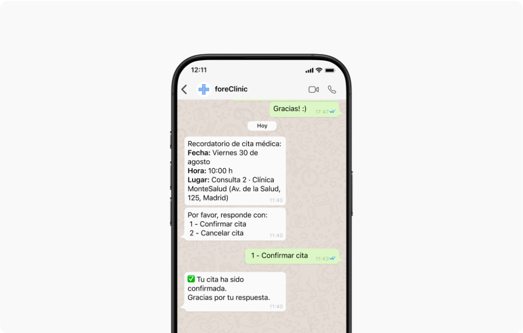 Con foreClinic puedes automatizar el envío de notificaciones por WhatsApp para mantener a tus pacientes informados sobre sus citas y facilitar la comunicación clínica del día a día. Todo centralizado desde la misma plataforma, sin necesidad de herramientas externas